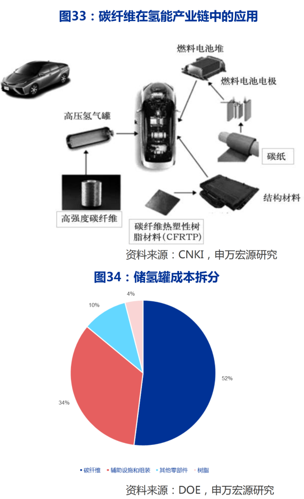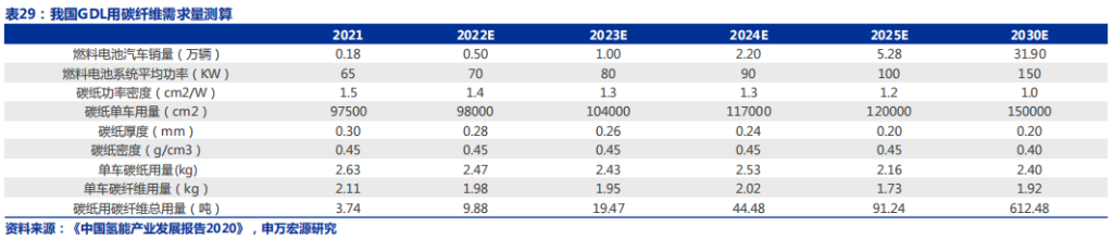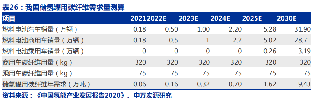 碳纤维是储氢罐最为主要的材料,据美国DOE数据,储氢罐成本占比超过50%,乘用车储氢罐单车用量为75kg,商用车储氢罐单车用量为320kg,结 合《中 国 氢 能 产 业 发 展 报 告2020》,2025/2030氢 燃 料电 池 汽 车10/100万辆的规划,九游老哥j9