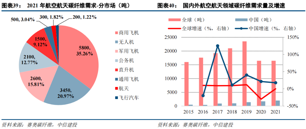 航空航天市场缓慢复苏,高附加值碳纤维使得该领域前景可观。2021 年全球航空航天领域中,商用飞机对