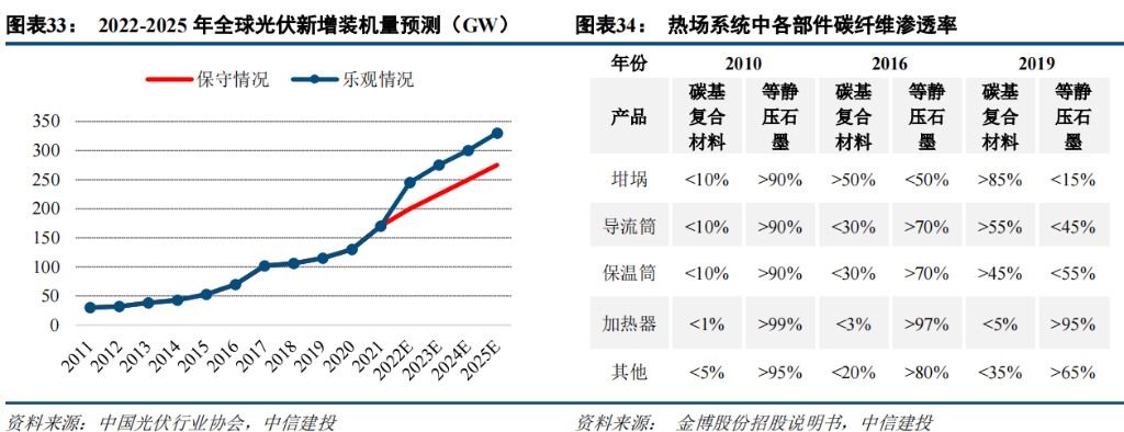 于双碳政策推动,我国光伏新增装机量将逐年稳步提升;我国光伏产业在全球占据优势地位,国内热场材料需